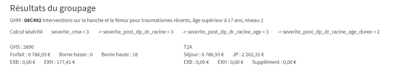 Sur la base de la documentation officielle (manuels des GHM, listes codes, référentiels PMSI), nous avons développé un algorithme permettant, à partir d’une grille minimale optimisée de saisie d’un séjour virtuel, d’expliciter les différentes étapes et caractéristiques de la classification en GHM et GHS et de la valorisation T2A d’un séjour MCO.